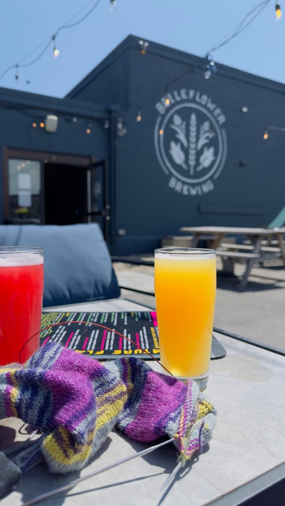 We stopped in Portland – partially for a yarn emergency, but mostly to try some local New England IPA’s. We chose Belleflower Brewing Company – in part because they had parking large enough for Louise, but mostly because the photos of their beers looked delicious.