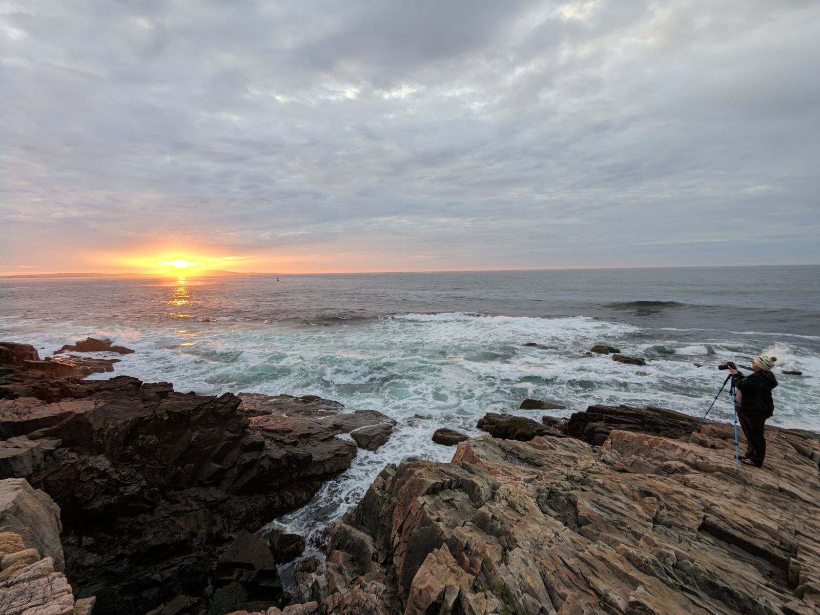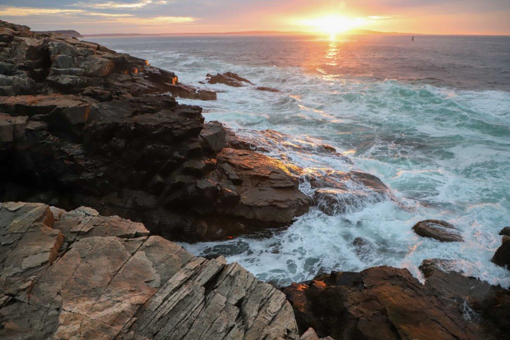 After an easy drive from Freeport, we arrived at Blackwoods Campground in Acadia National Park. This is one of the most beautiful campgrounds I’ve stayed at (It ranks up there with Moraine Park in Rocky Mountain National Park!) It was built by the Civilian Conservation Corps in about 80 years ago, so the sites are pretty small and like all American NPS campgrounds, doesn’t have showers, but the beauty makes those negatives disappear! It’s heavily forested by beautiful, tall pine and fir trees, and you can walk to the ocean in about five minutes and sit on a rocky cliff overlooking the Atlantic! It was a perfect place for sunset beers our first evening!