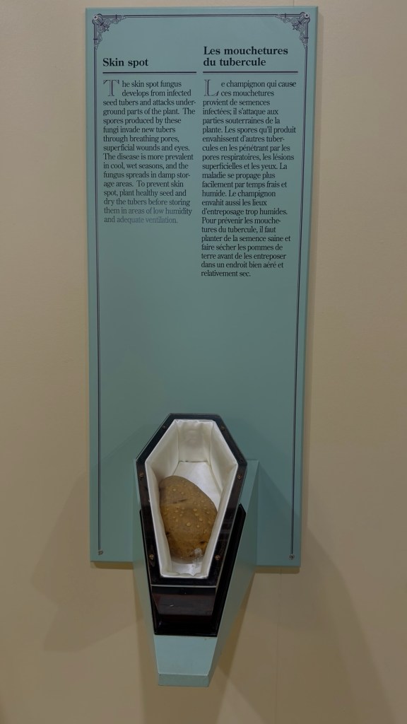 By far, my favorite exhibit was the one about all of the things that are deadly to potatoes….. assorted bugs and slugs, molds, and other pests. I never really considered what might kill a potato, but the way these deaths were portrayed was brilliant. Mounted to the wall, there was a life size replica of the potato and it’s ailment – slugs, mold, frostbite – you name it – inside of a tiny coffin, complete with satin lining. I’m not sure who the person was that thought “Hey, let’s make some dead potato props and put them in coffins” but I want to meet that genius and shake their hand.